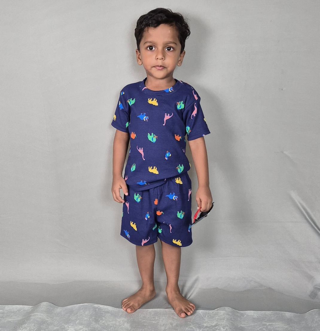 - Fun Dinosaur Print: The T-shirt and shorts are covered in a cheerful, repeating pattern of various multi-colored dinosaurs, adding a prehistoric punch to their style.