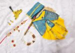 Transform your little one into Lord Krishna with this complete costume set! Includes a yellow dhoti, Rama Blue angavastram, peacock crown, flute, and accessories. Perfect for Janmashtami and fancy dress. Available for ages 6 months to 3 years.