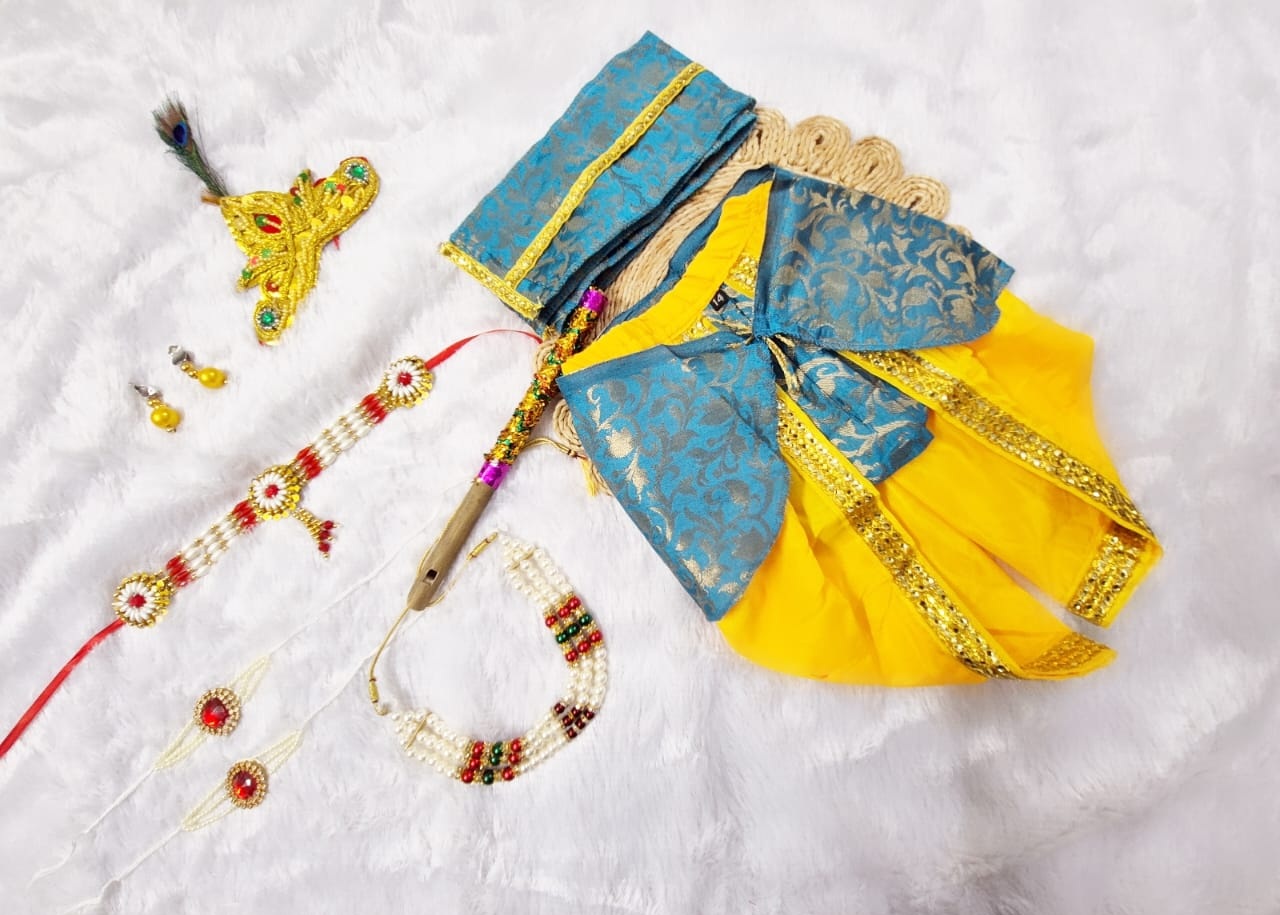 Perfect for Janmashtami celebrations, cultural events, or simply delightful playtime, this meticulously crafted outfit transforms your little one into the beloved deity. Designed for comfort and authenticity, each piece is made with attention to detail, ensuring your child looks adorable and feels at ease.