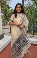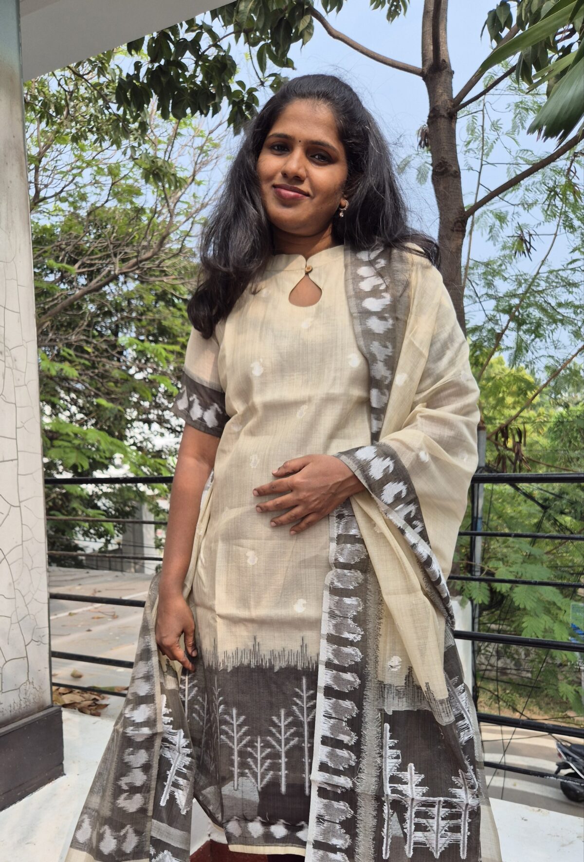 Embrace traditional charm with a modern twist. This stunning Kurta set features a cream-colored base adorned with delicate white motifs and a bold charcoal-grey border showcasing artistic tree patterns. The top is designed with a classic keyhole neckline and short sleeves, providing a clean and polished silhouette.