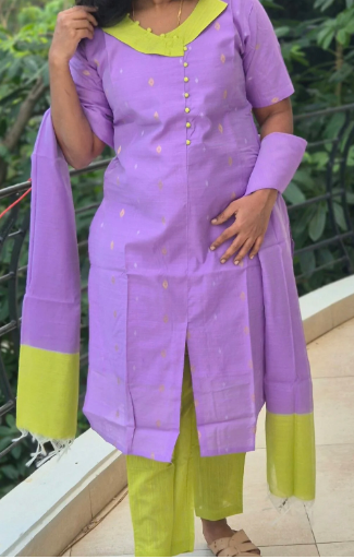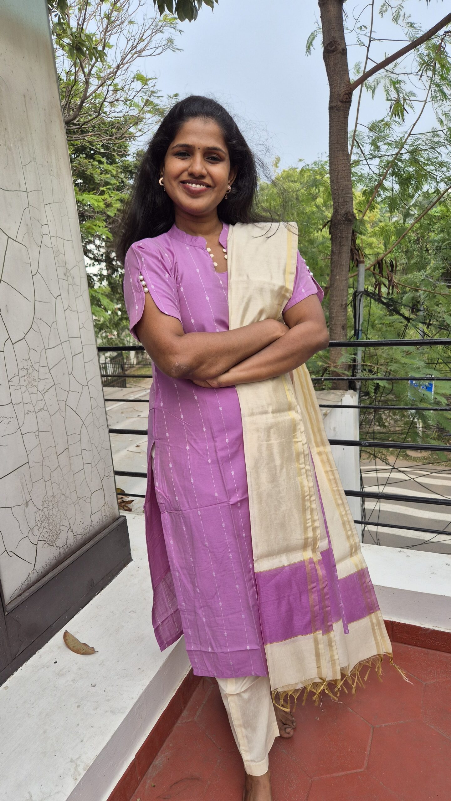 Elevate your everyday elegance with this soothing Lilac 3-piece set featuring Lilac Kurta paired with a premium cream dupatta featuring a metallic gold zari border and cream coloured Pant. Featuring delicate pearl accents along the neckline and sleeves, this soft fabric ensemble is very comfortable to wear for office hours or social gatherings.
