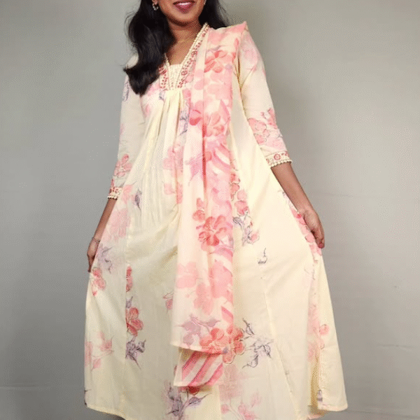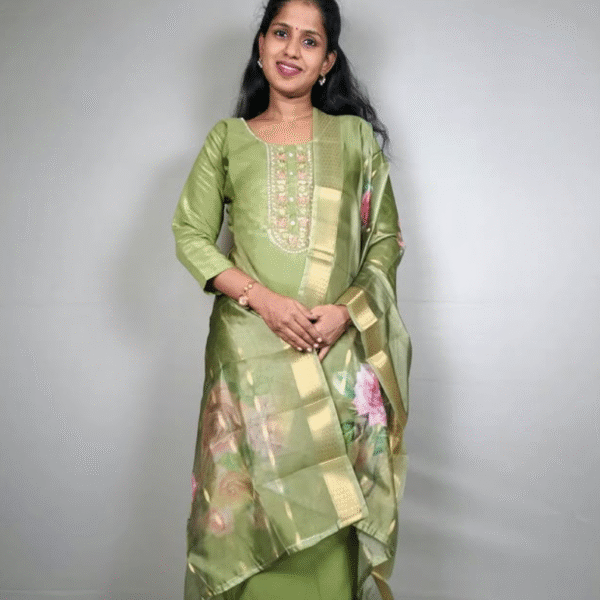 This elegant three-piece suit set in a vibrant red is a true showstopper. The kurti and pant are crafted from premium Raw Silk, a fabric known for its rich texture and natural sheen. The straight-cut kurti features exquisite zari and thread embroidery on the yoke, creating a beautiful and intricate design. Small embroidered motifs are scattered across the kurti for a cohesive look. The set is completed by a luxurious Banarasi dupatta with a rich woven border and subtle patterns. The kurti is fully lined, ensuring a comfortable and perfect drape. This suit is perfect for festive celebrations, weddings, or any special occasion where you want to make a lasting impression.