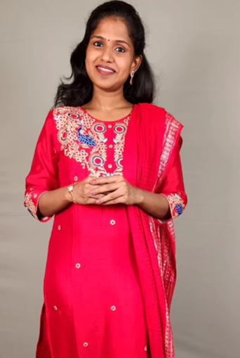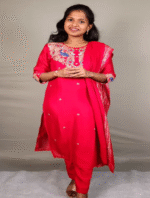 Add a touch of festivity to your wardrobe with this beautiful Raw Silk suit. The three-piece set includes an embroidered kurti, matching pant, and a striking dupatta. The red kurti has a rich, textured feel and features a beautifully detailed embroidered neckline. The elegant look is completed with a coordinating Banarasi dupatta that has a stunning woven border. This suit is comfortable and stylish, making it a perfect choice for any special occasion.